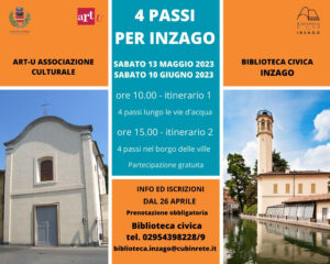 La Biblioteca Civica di Inzago, in collaborazione con l’associazione culturale Art-U, ha organizzato l’iniziativa “4 passi per Inzago”. Al via il secondo appuntamento quello del 10 giugno.   ORE 10.00: 4 passi lungo le vie d’acqua ritrovo Parco della Conca, via Lazzaretto, angolo di via Turati alle ore 9.45 mentre l’appuntamento delle ore 15.00 avrà il ritrovo alle ore 14.45 di fronte a palazzo Piola, p.zza Quintino di Vona , dal nome  “4 passi nel borgo delle ville” La prenotazione è obbligatoria. Per informazioni ed iscrizioni, è possibile contattare la Biblioteca Civica al numero 02/95.43.98.228/9 o inviare una email a [email protected]. Per tutte le info Clicca qui