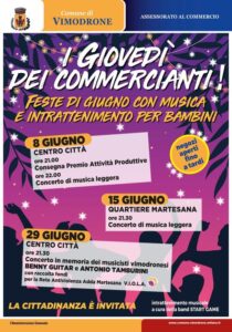 Giovedì 29 giugno si conclude la rassegna di eventi con un concerto in memoria dei musicisti vimodronesi Benny Guitar e Antonio Tamburini con una raccolta fondi in favore della Rete Antiviolenza Adda Martesana V.I.O.L.A. attiva sul territorio. Tutte le iniziative previste per la manifestazione “I Giovedì dei Commercianti”, si terranno invece come da programma per le vie del Centro anche in caso di maltempo.