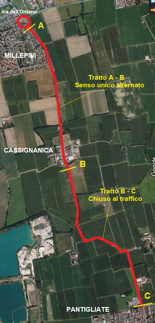 Il transito veicolare verrà garantito a senso unico alternato nel tratto compreso tra via dell’Ontano a Millepini e p.zza Grassi a Cassignanica (tratto A – B).