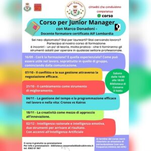 Il Comune di Cassano d’Adda, in collaborazione con la Biblioteca Civica, propone, nell’ambito del progetto “Beni Comuni” il corso “Junior Manager”. Un ciclo di sei appuntamenti di 4 ore che si terranno il 16 settembre, il 7 e il 21 ottobre, il 4 e il 18 novembre e il 2 dicembre dalle 14 alle 18 con Marco Donadoni docente formatore certificato AIF Lombardia e con certificazione finale.