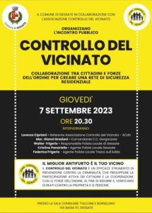 L’appuntamento è fissato per l’8 settembre alle 20.30, a ingresso libero, in Sala Consiliare con gli interventi di Lorenzo Cipriani Referente Associazione Controllo del Vicinato ACdV, Maresciallo Gianni Graziani Comandante C.C. Gorgonzola, Walter Frigerio Responsabile Polizia Locale Gessate e Federica Frigerio Agente Polizia Locale Trezzo sull’Adda.