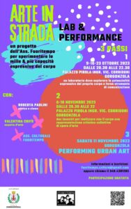 «Il progetto “Arte in strada” nasce dal desiderio dell’associazione Fuoritempo di proseguire nell’attività di ricerca e di esplorazione dei diversi linguaggi teatrali e di coinvolgere in tale ricerca chiunque voglia condividere la passione per il teatro in tutte le sue espressioni. – si legge nella nota di presentazione del progetto – Il linguaggio che si intende esplorare con questo progetto è quello del corpo, riscoprendone le potenzialità espressive (corpo comico, corpo poetico) attraverso un laboratorio aperto ai cittadini interessati condotto dall’attrice professionista Roberta Paolini».