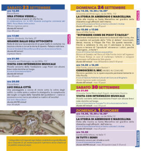 Sabato 30 settembre alle ore 21.00 presso la Chiesetta Santa Maria Degli Angeli in via provata Aguzzina, una visita con intermezzo musicale, piccolo concerto della Associazione PROART con alcune brevi note storiche sul luogo.Domenica 1 ottobre alle ore 14.30,15.30 e 16.30 presso la Chiesetta Sant’Ambrogio, in via dei mille 112 La Storia di Ambrogio e Marcellina con visita alla mostra su Santa Marcellina nel giardino della chiesetta e agli affreschi dell’interno. Alle ore 15.30 cortile della lettura in via Italia 11 ” in tutti i sensi” itinerario sonoro per strade e corti. Per tutto il programma Clicca qui