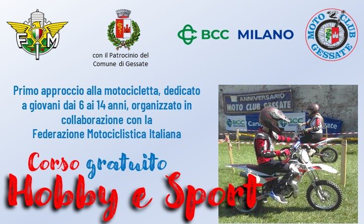 Il Moto Club di Gessate organizza, in collaborazione con Federazione Motociclistica Italiana l’evento “HOBBY E SPORT”, un corso gratuito di primo approccio alla motocicletta dedicato ai ragazzi dai 6 ai 14 anni, che si terrà domenica 10 settembre dalle ore 9.30 presso l’Oratorio in via IV novembre 4.