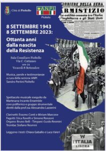 A Pioltello, nell’ambito della manifestazione “FesteggiAMO Pioltello” che si terrà l’8, il 9 e il 10 settembre, l ’A.N.P.I Associazione Nazionale Partigiani Italiani sezione “Sandro Pertini” di Pioltello, con il patrocinio del Comune di Pioltello, ha organizzato l’evento “8 settembre 1943-8 settembre 2023- Ottanta anni dalla nascita della Resistenza” con lo spettacolo musicale, a ingresso libero, che si terrà venerdì 8 settembre alle 21 in Sala Consiliare.