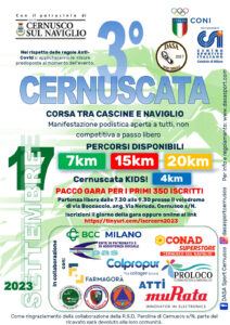 Torna la “Cernuscata – Corsa tra cascine e naviglio” con la sua terza edizione. Domenica 17 settembre l’evento podistico, ludico motorio, non agonistico.. Si parte dal Velodromo.