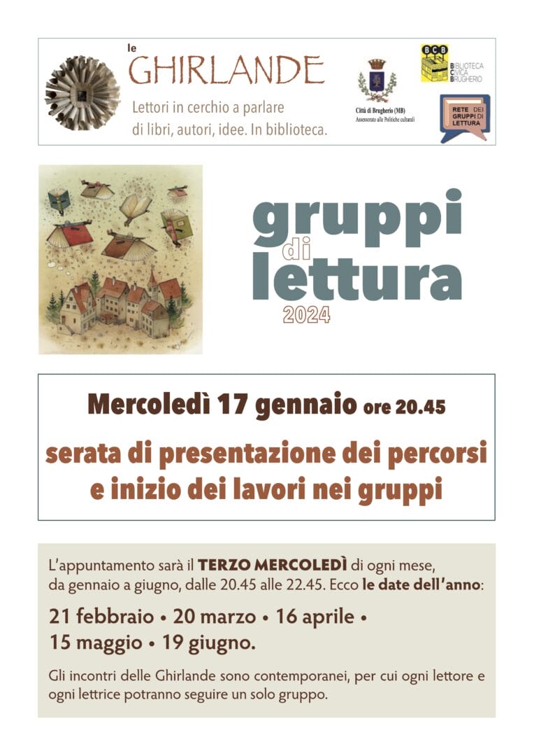 La Biblioteca Civica di Brugherio torna a proporre l’iniziativa “Ghirlande 2024. Lettori in cerchio a parlare di libri, autori, idee”. Mercoledì 17 gennaio alle 20.45 presso la Sala Conferenze della Biblioteca Civica si terrà la serata di presentazione e l’avvio della nuova stagione dei Gruppi di Lettura della Biblioteca.