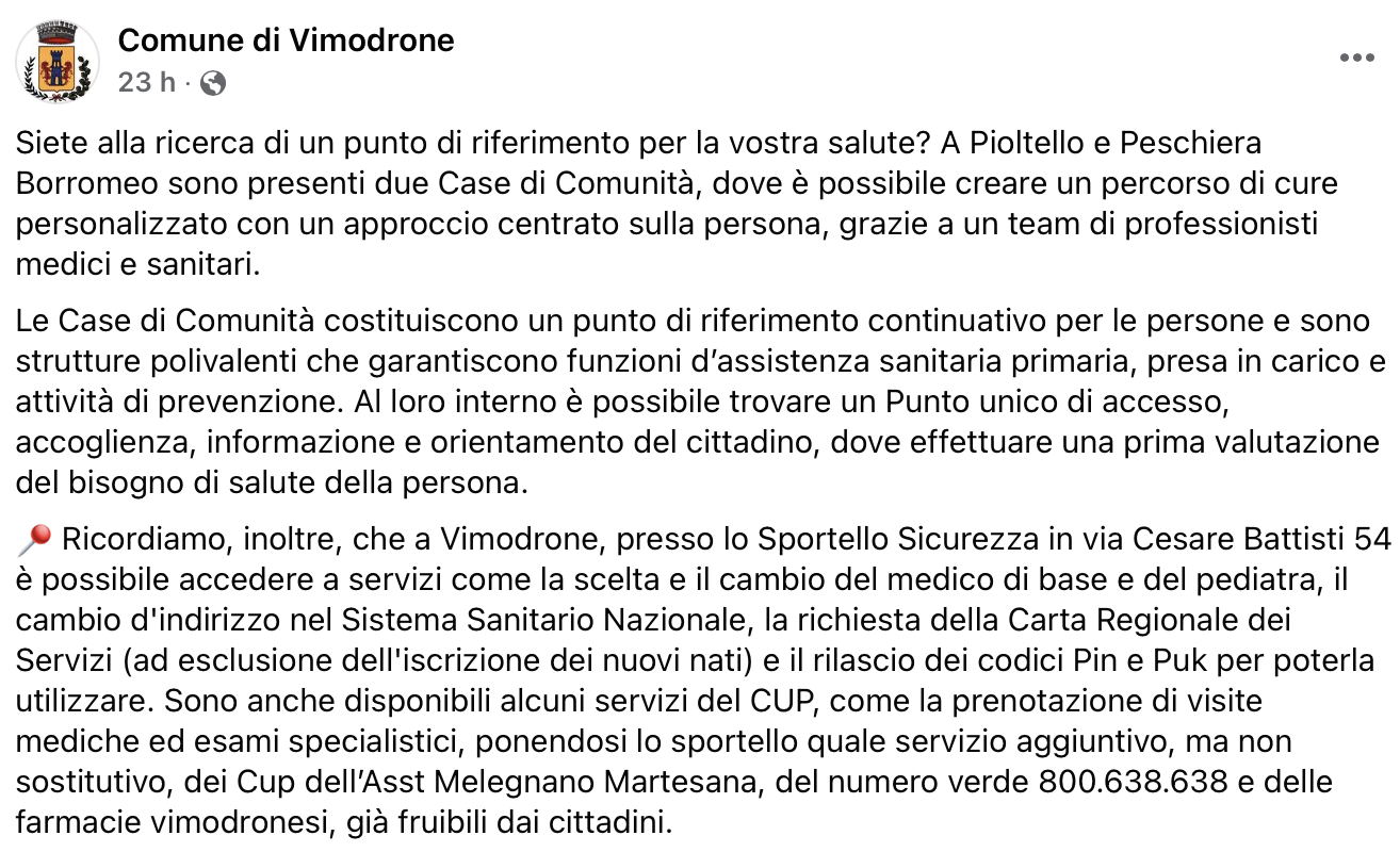Se a Bussero, i cittadini e gli amministratori alzano la voce, promettendo proteste pacifiche tutti i giovedì mattina fuori la Casa di Comunità di Gorgonzola per sottolineare un problema comune, a Vimodrone la situazione sembra diversa. Nonostante negli scorsi mesi anche l’Amministrazione vimodronese ha sollevato critiche nel sistema di gestione dei medici di famiglia, che lasciava 750 cittadini senza medico di famiglia, nello stesso giorno della protesta, la scelta di pubblicazione di un post sui canali ufficiali del Comune per sottolineare l’importanza delle Case di Comunità come “punto di riferimento” per la salute dei cittadini.