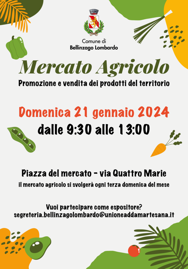 Il nuovo Mercato agricolo di Bellinzago Lombardo si propone come un appuntamento fisso mensile: dalle 9:30 alle 13:00, saranno presenti le aziende agricole del territorio, cooperative sociali e produttori con i propri prodotti.