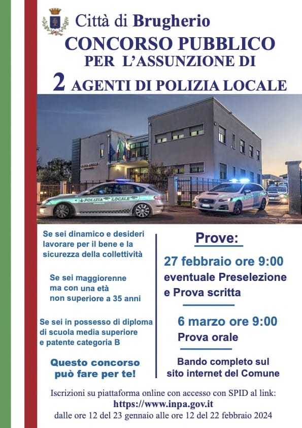 La Città di Brugherio ha indetto, in questi primi giorni del 2024, un nuovo concorso per l’assunzione di due nuovi agenti di polizia Locale che andranno a rinforzare l’organico degli agenti effettivi del Corpo della Polizia Locale cittadina.