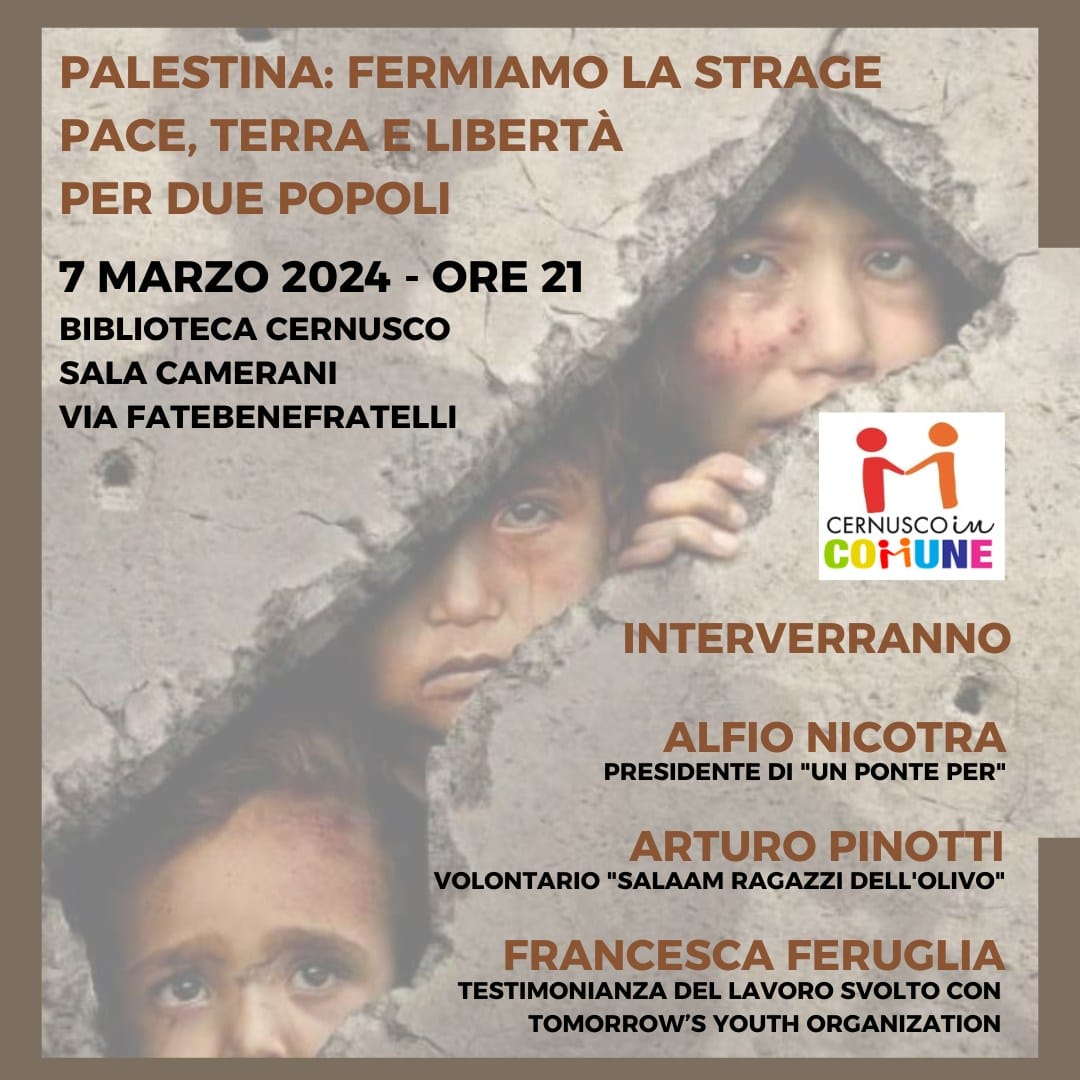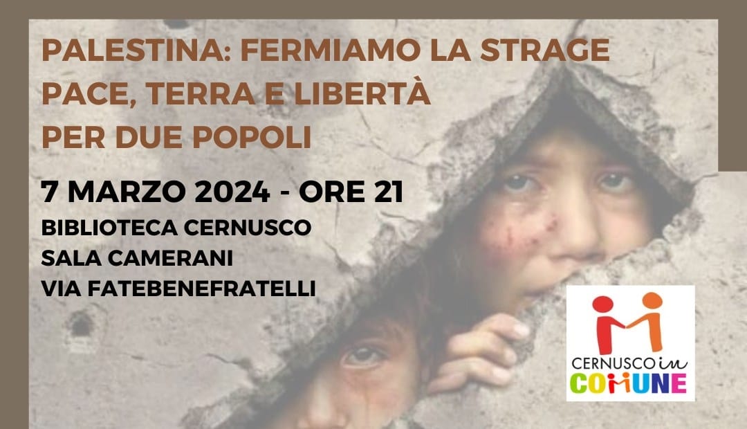 Giovedì 7 marzo, alle ore 21:00, presso la sala Camerani della Biblioteca di Cernusco in via Fatebenefratelli, si terrà l’incontro”Palestina: fermiamo la strage. Pace, terra e libertà per due popoli“.