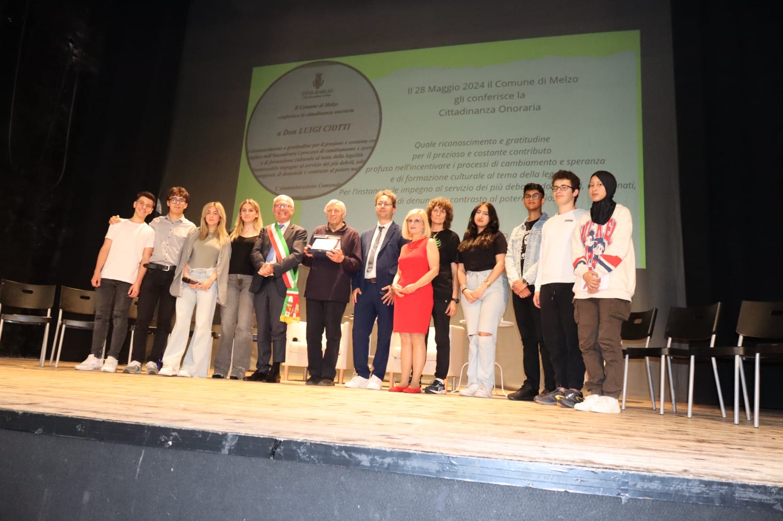 Ieri l’Amministrazione Comunale di Melzo ha conferito a Don Luigi Ciotti la cittadinanza onoraria durante l’incontro organizzato con gli studenti del Liceo Giordano Bruno e dell’Istituto Ipsia a Teatro Trivulzio.