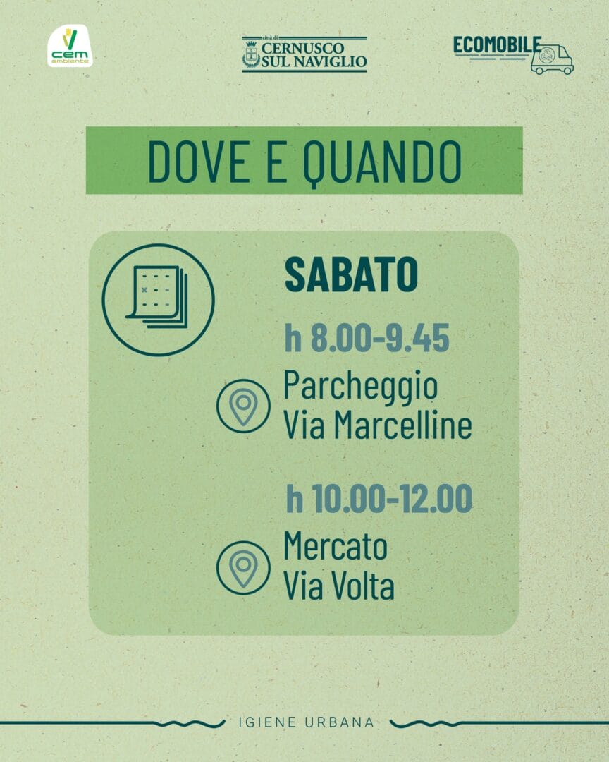 , l’Ecomobile sarà presente dalle 8 alle 9.45 al parcheggio di via Marcelline e dalle 10 alle 12 nell’area del Mercato di via Volta.