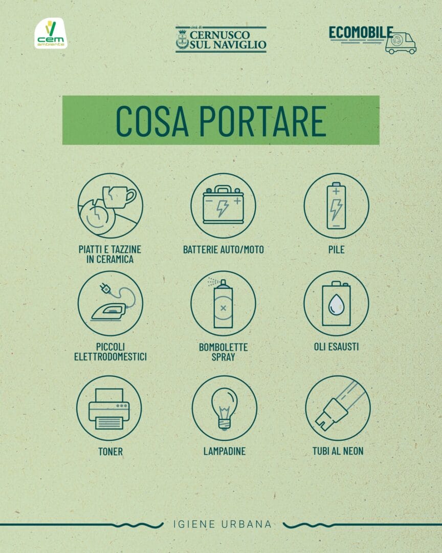 L’Amministrazione Comunale di Cernusco sul Naviglio ha comunicato che, a partire da sabato 18 maggio tutti i sabati, sarà attiva sul territorio l’Ecomobile, stazione viaggiante di Cem Ambiente Spa attrezzata per la raccolta, lo stoccaggio e il trasporto di piccole quantità di particolari rifiuti che dovrebbero essere conferiti alla piattaforma ecologica.