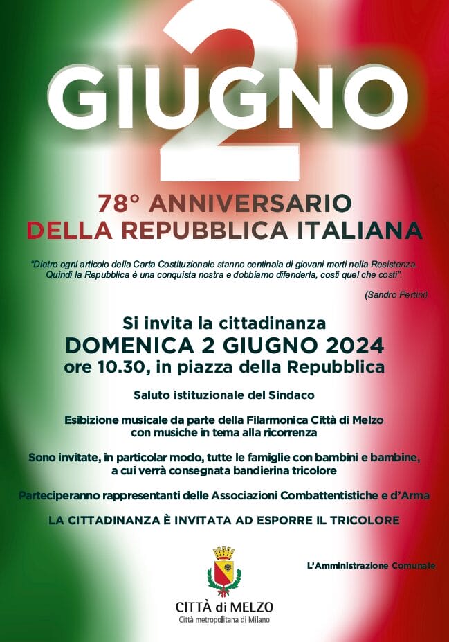 Domenica 2 giugno alle 10.30 in piazza della Repubblica si terrà Saluto istituzionale del Sindaco Antonio Fusè. A seguire l’esibizione musicale da parte della Filarmonica Città di Melzo con le musiche in tema della ricorrenza.