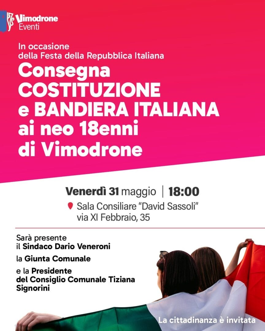 In occasione delle celebrazioni per la Festa della Repubblica Italiana, venerdì 31 maggio, alle ore 18:00, il Sindaco Dario Veneroni consegnerà una copia della Costituzione e una bandiera italiana a tutti i nuovi maggiorenni di Vimodrone.