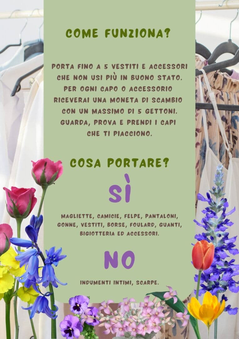 - sempre dalle 15 all 18, sarà attivo il “Flowers Swap Party”, festa del baratto e mercatino di abiti usati per scambiarsi capi di abbigliamento rinnovare il proprio look e dare nuova vita ai capi nell’armadio avendo sempre a cuore il pianeta. Ogni partecipante potra portare 5 capi di abbigliamento da scambiare;
