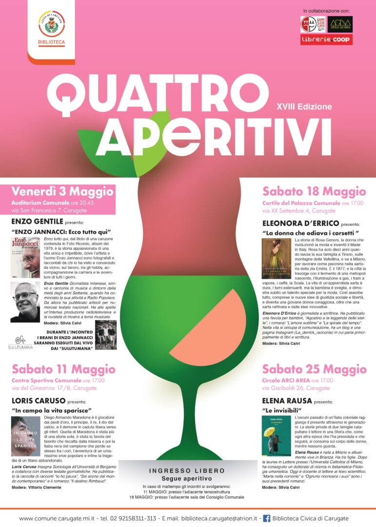 Dal 3 maggio al 25 maggio, si è tenuta la XVIII edizione di Quattro Aperitivi, la rassegna organizzata dalla Biblioteca civica di Carugate.