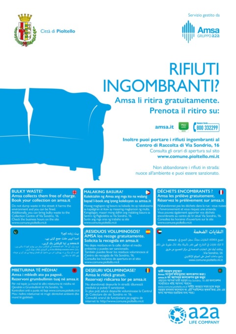 Per aiutare i cittadini, torna la campagna informativa per ricordare ai cittadini come comportarsi in caso di smaltimento di rifiuti ingombranti. Le soluzioni, oltre ad essere gratuite, saranno spiegate nei manifesti multilingua che saranno affissi per la città di Pioltello nei prossimi giorni: oltre all’italiano, altre 9 lingue (inglese, francese, spagnolo, rumeno, albanese, arabo, filippino, urdu, bengali).